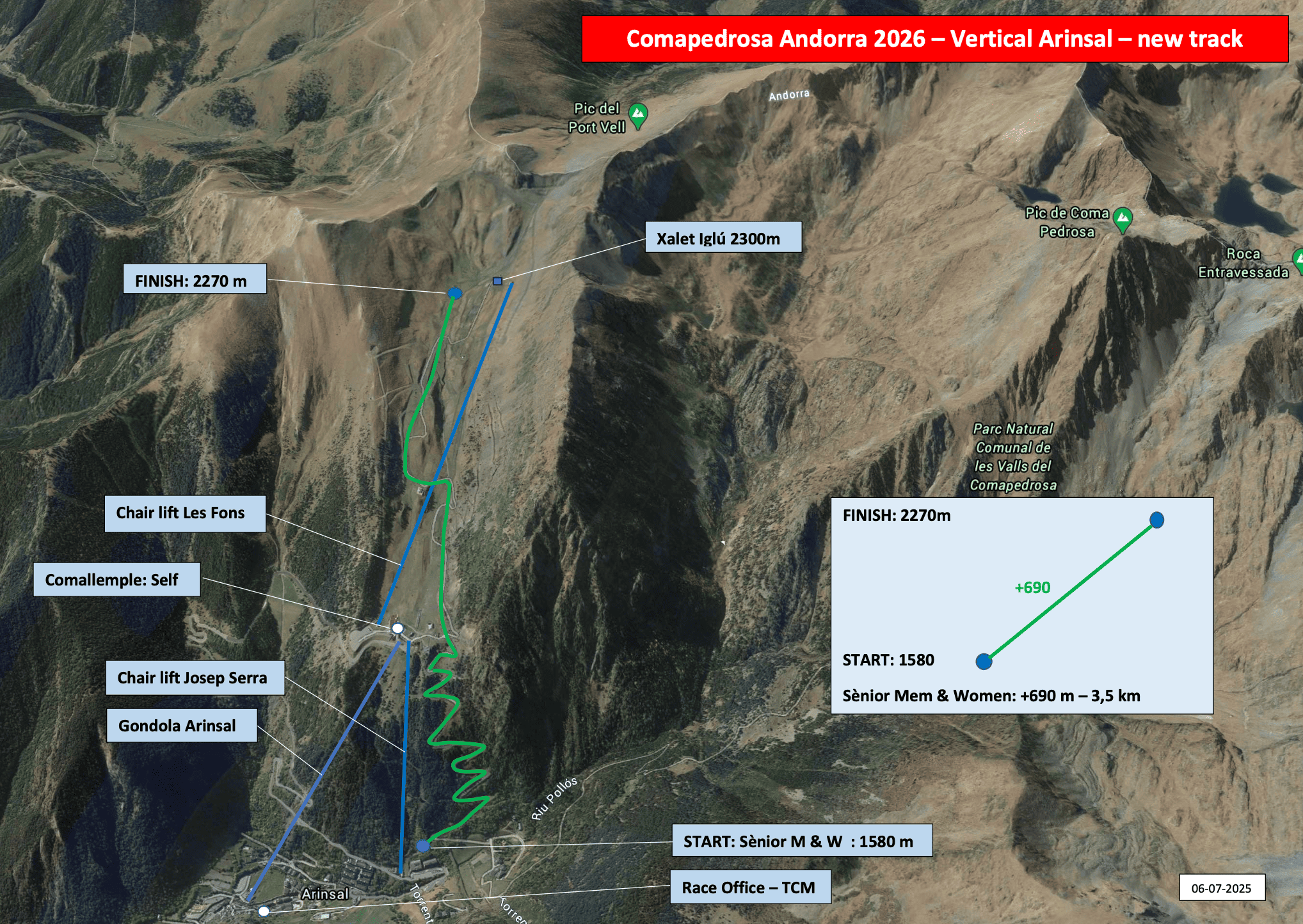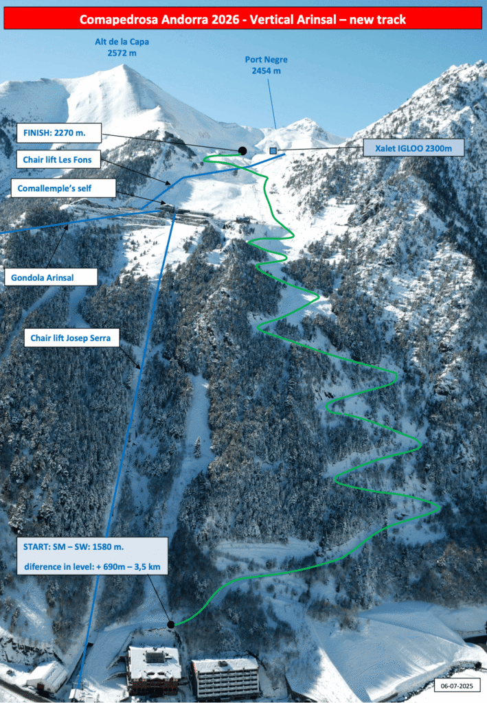 La Vertical Arinsal és la última prova de la Comapedrosa Andorra. El recorregut vertical Comapedrosa és molt especial per als participants, ja que es realitza integralment per la pista d’esquí, la qual cosa permet als esportistes donar el 100% sense que es generi cap interferència durant la progressió. Això la converteix en una cursa única i molt atractiva tant per als corredors com per als espectadors de Comapedrosa Andorra World Cup.